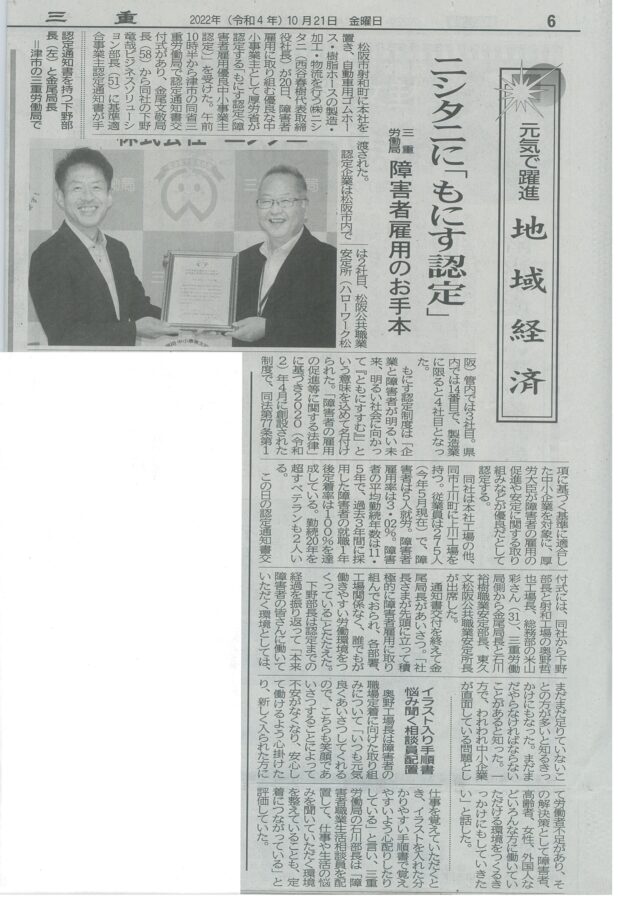 この度三重県労働局様より”障害者雇用優良中小事業主(もにす認定事業主)”として認定を受けました。