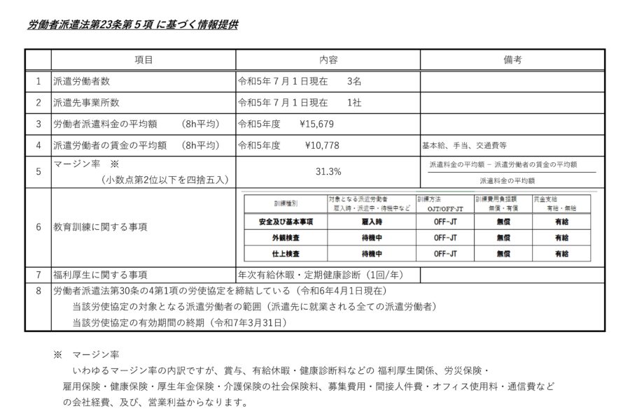 派遣事業情報公開 2025 / 04 / 01 情報公開 派遣事業情報公開厚生労働省職業安定局 人材サービス総合サイトへのリンクはこちらから→LINK ≪ 前の記事 射和工場 2S活動 次の記事 ≫ 入社式